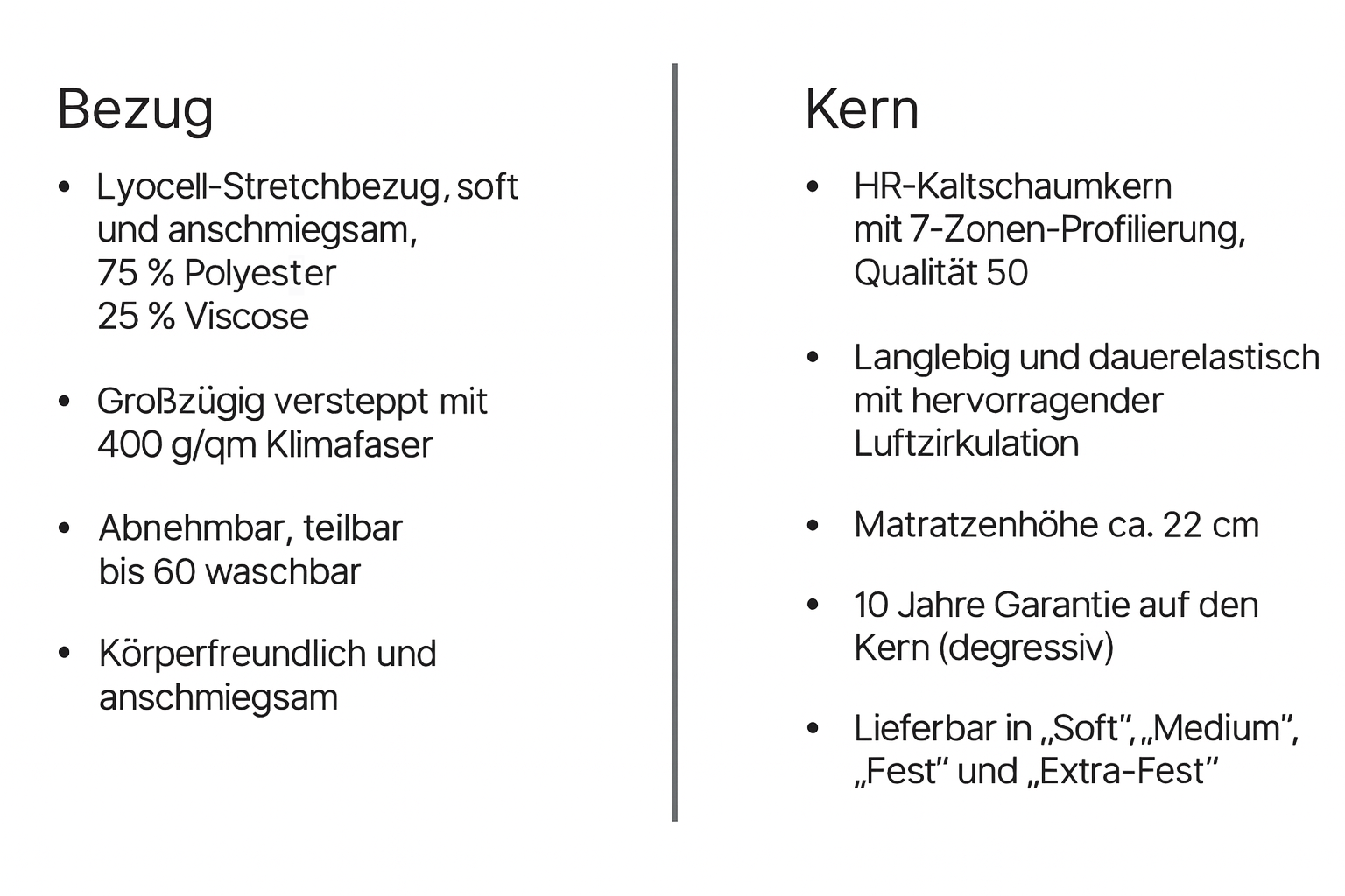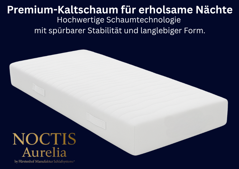 Die Noctis Aurelia steht für erstklassigen Liegekomfort und hochwertige Materialien. Ihr hochresilienter (HR) Kaltschaumkern sorgt für eine präzise Körperanpassung und eine dauerhaft stabile Unterstützung – ideal für alle, die Wert auf gehobene Qualität und beständige Formstabilität legen.
