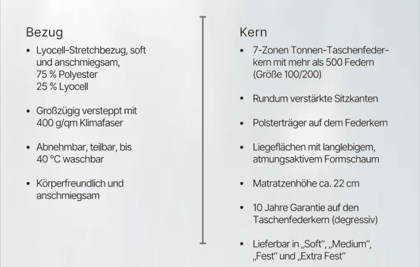 Ihr Premium-Taschenfederkern sorgt für eine präzise, punktelastische Unterstützung und ein ruhig getragenes Liegegefühl.