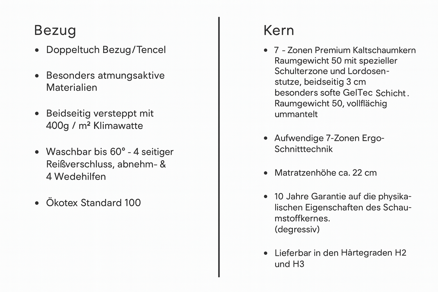 Die gezielte Zonenanpassung im Schulter‑ und Beckenbereich unterstützt den Körper genau dort, wo Entlastung benötigt wird. So entsteht ein harmonisch ausbalanciertes Liegegefühl, das Wirbelsäule und Muskulatur natürlich ausrichtet und einen ruhigen, regenerativen Schlaf fördert.