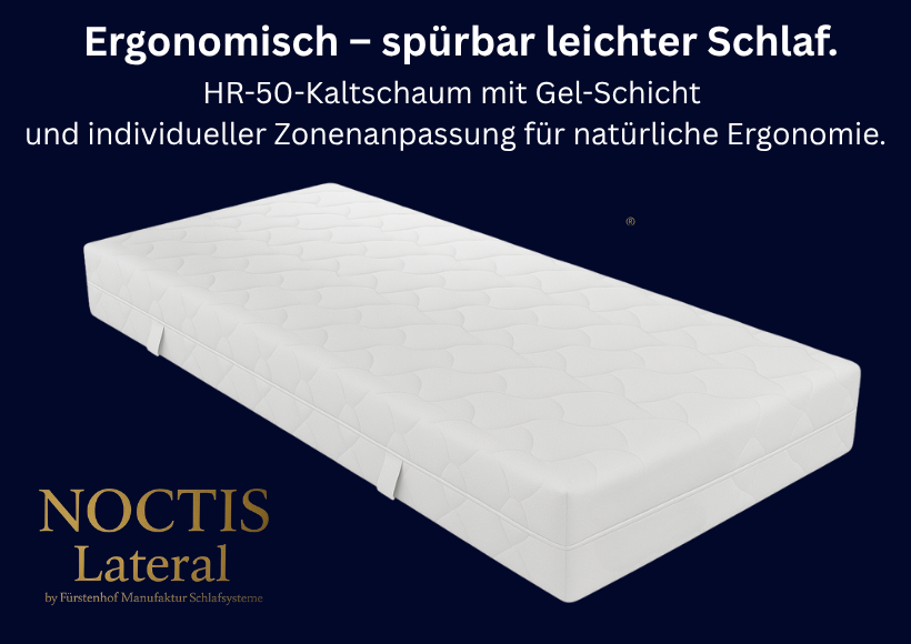 Die Noctis Lateral vereint moderne Materialien mit einer durchdachten ergonomischen Schlafarchitektur. Ihr hochresilienter HR‑50‑Kaltschaumkern bietet gleichmäßige Unterstützung und langlebige Elastizität, während die integrierte Gel‑Schicht den Liegekomfort verfeinert – sanft anschmiegsam, dabei angenehm stabil.