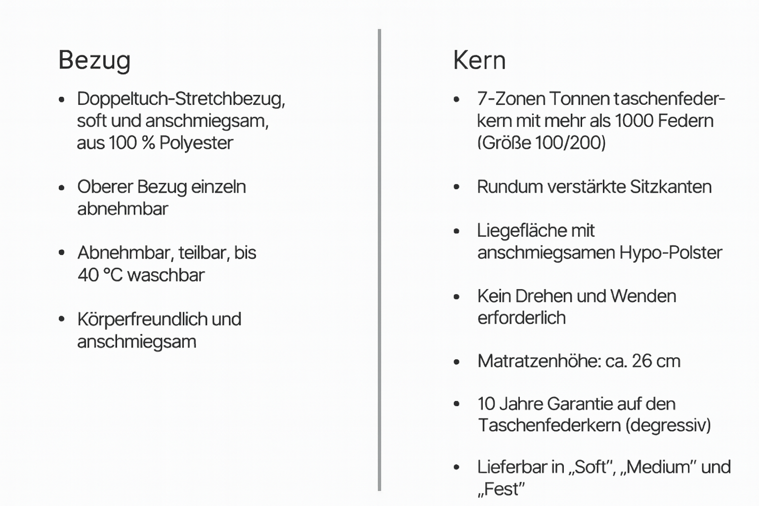 Jede einzelne Feder reagiert punktgenau auf Bewegung und entlastet den Körper gleichmäßig. Die Hypo-Komfortschicht verleiht der Matratze eine sanfte, geschmeidige Oberfläche und schafft ein Gefühl von Ruhe und Balance, das über herkömmlichen Federkernkomfort hinausgeht.