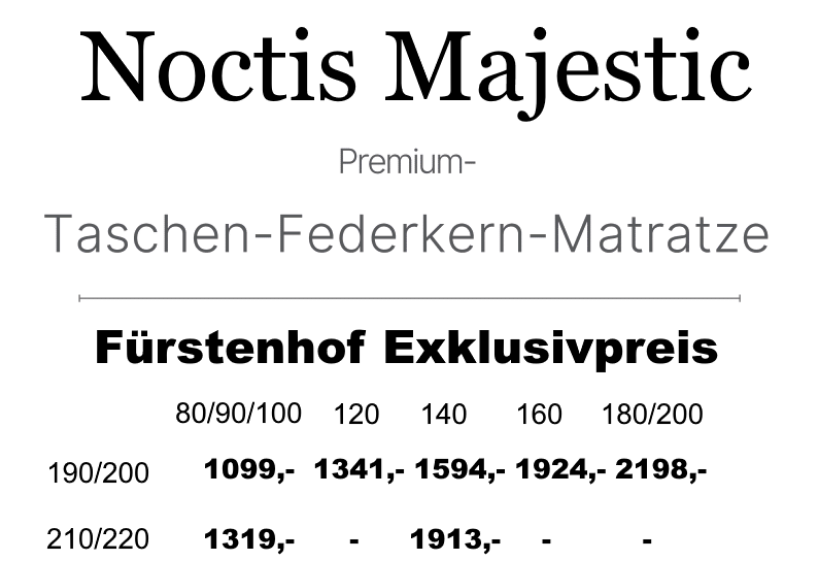 Mit ihrer 4,5-Sterne-Bewertung repräsentiert die Noctis Majestic eine wertige Premiumausführung mit feineren Materialien, präziser Verarbeitung und dauerhafter Formstabilität. Die 10 Jahre Garantie auf den Matratzenkern unterstreicht den Anspruch auf Qualität und Beständigkeit.