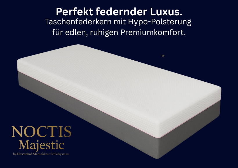 Die Noctis Majestic steht für einen spürbar aufgewerteten Premium-Komfort innerhalb der Noctis-Kollektion. Ihr hochwertiger Taschenfederkern in Kombination mit der fein abgestimmten Hypo-Polsterung sorgt für ein besonders harmonisches Liegegefühl, das stabil trägt und zugleich angenehm weich abfedert.