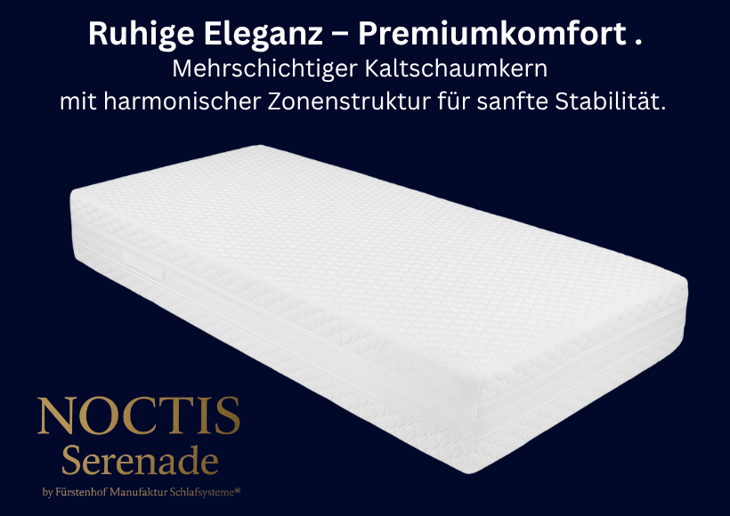 Die Noctis Serenade steht für gehobenen Premium-Komfort mit fein abgestimmter Schaumtechnologie. Ihr mehrschichtig aufgebauter Kaltschaumkern kombiniert unterschiedliche Schaumzonen und Dichten zu einem harmonisch abgestimmten Liegegefühl. Jede Schicht erfüllt eine eigene Funktion – von stabiler Basis bis zur anschmiegsamen Komfortlage – und sorgt so für präzise Körperanpassung und angenehme Ausgeglichenheit.