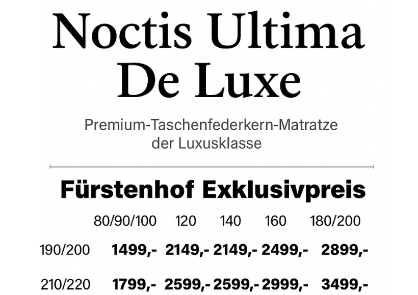 Die Noctis Ultima De Luxe ist die Meisterklasse moderner Schlafkultur – eine Matratze, die höchste Ansprüche an Komfort, Qualität und Handwerkskunst erfüllt. Ihr mehrschichtig aufgebauter Premiumkern vereint fein abgestimmte Hochleistungsschäume mit einer präzisen Taschenfederstruktur, um eine perfekt balancierte Körperanpassung und unvergleichliche Ruhe zu bieten.